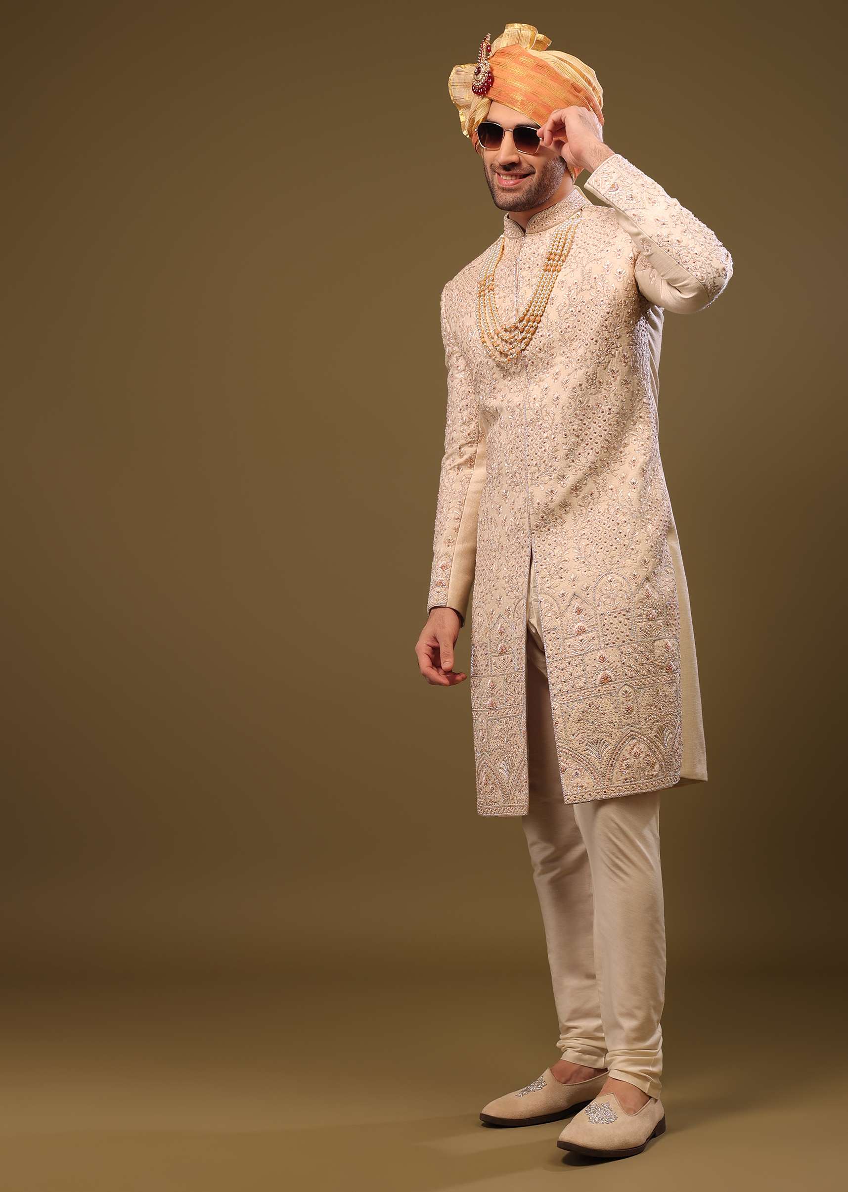 A classic bisque peach sherwani set fabricated in silk, and crafted in hand-embroidered resham, embellished stones, french knots, and thread weave in a beautiful design.It has full sleeves and an embroidered mandarin collar, a front closure, and comes with matching bottoms.Buttons and Accessories may vary in color, shape and size. Awarded as the Most Trusted Brand, we're delivering styles you love, just as promised.