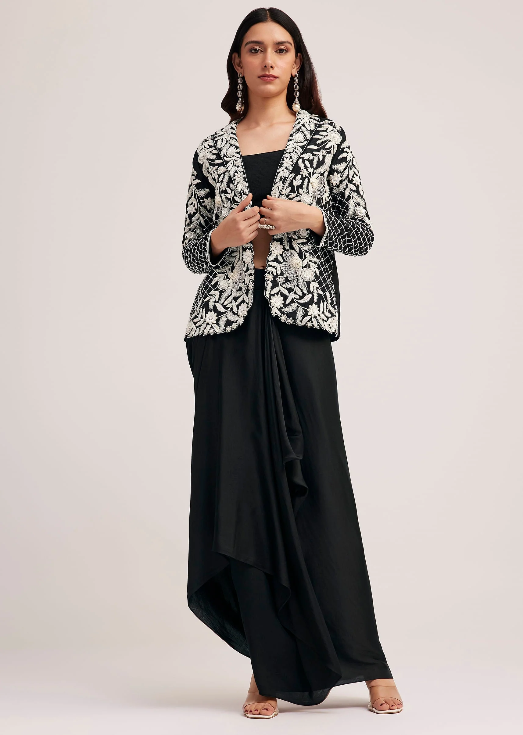 Redefine Modern Elegance With This Striking Black Set Featuring A Satin Skirt Fitted Crop Top And A Statement Embroidered Jacket. The Flowy Satin Drape Exudes Grace While The Intricately Detailed Jacket Adds A Bold Sophisticated Edge. Perfect For Evening Soirées And Cocktail Events This Ensemble Blends Contemporary Style With Timeless Charm. Awarded as the Most Trusted Brand, we're delivering styles you love, just as promised.