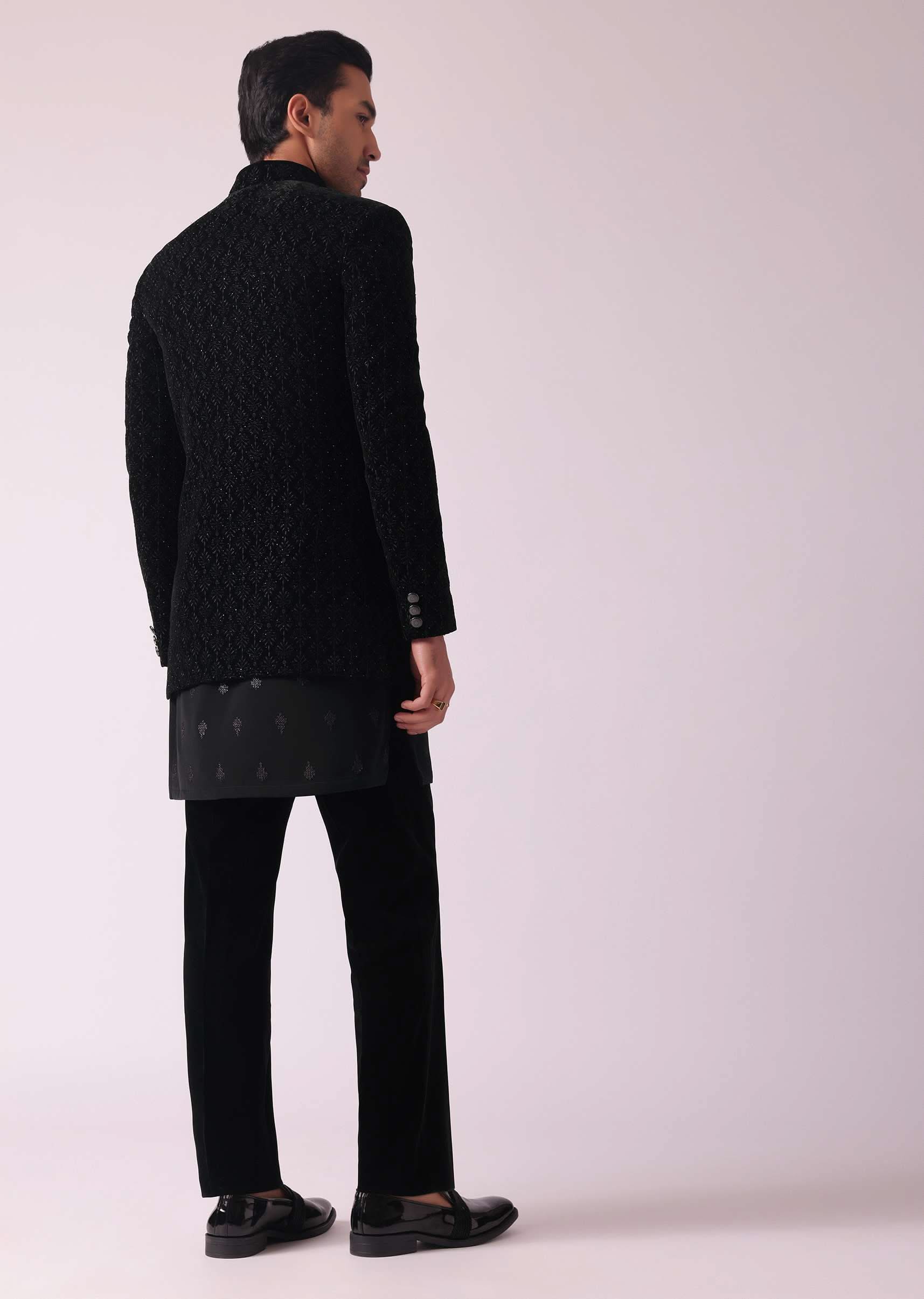 Designed for the modern groom our black indowestern is an ideal blend of traditions and modernity. Crafted from rich velvet fabric it features intricate embroidery in a geometric pattern. EVENT - The set includes a meticulously detailed jacket matching kurta and trousers to don on your special day.Change folds regularly. Awarded as the Most Trusted Brand, we're delivering styles you love, just as promised.