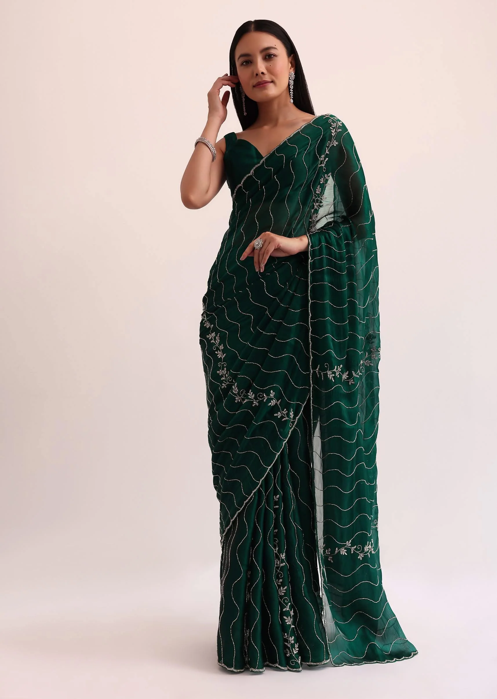 Bottle Green Chinon Saree With Cut Dana Embroidery And Unstitched Blouse