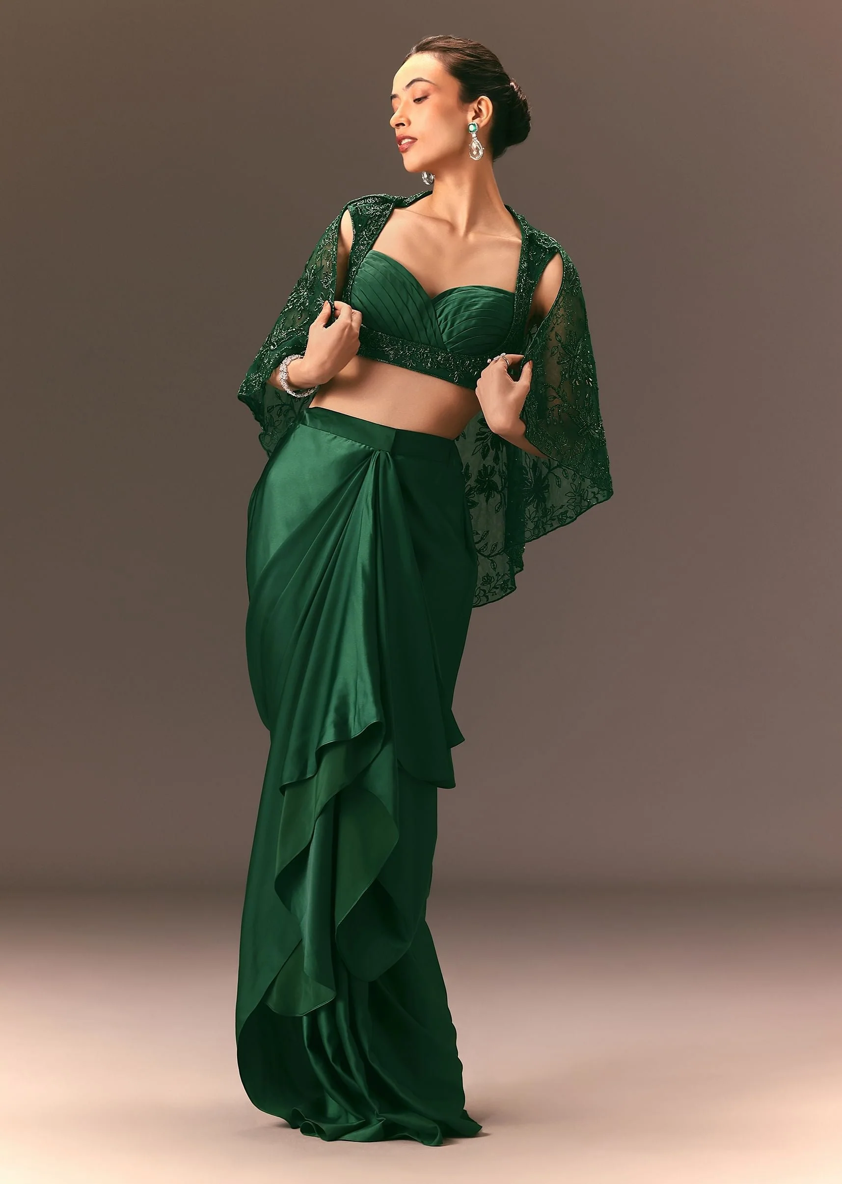 Bottle Green Net Hand Work Fusion Draped Skirt Set