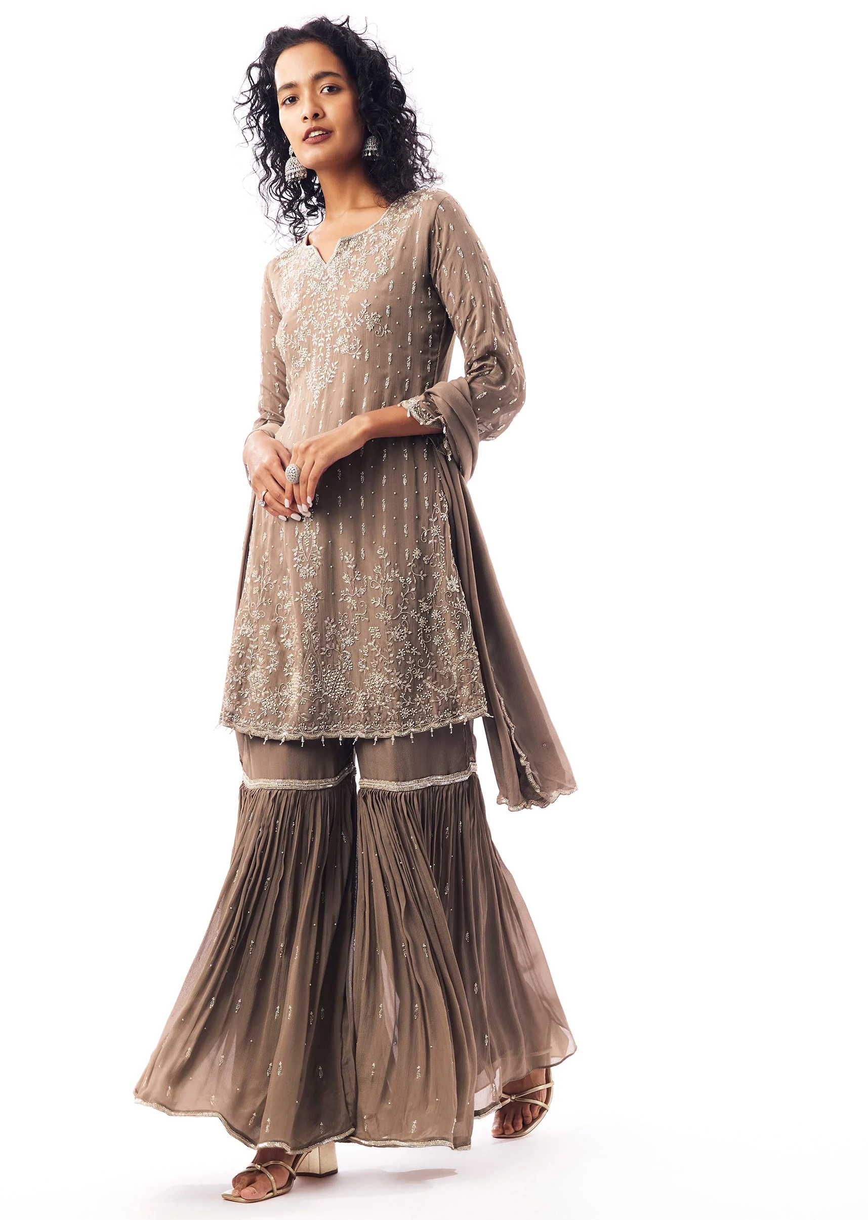 Brown Sharara Suit With Cutdana And Moti Highlights