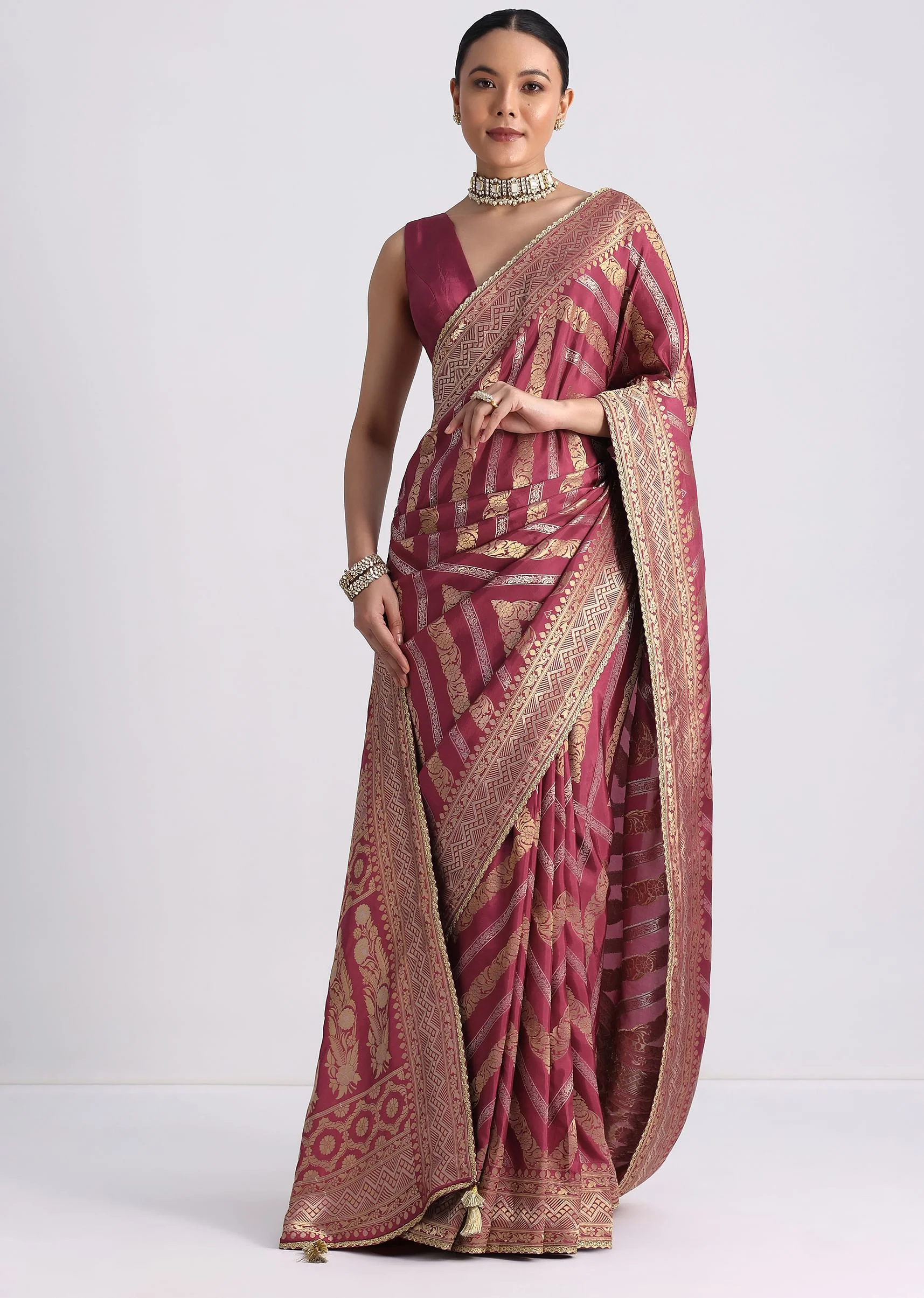 Embrace the season of vibrant festivities and grandeur weddings with our purple dola silk saree. Featuring a lace border pallu, this luxurious saree stays true to timeless style and design. The beautiful medley of jewel tones and expert craftsmanship is enhanced with intricate zari weaves. Awarded as the Most Trusted Brand, we're delivering styles you love, just as promised.
