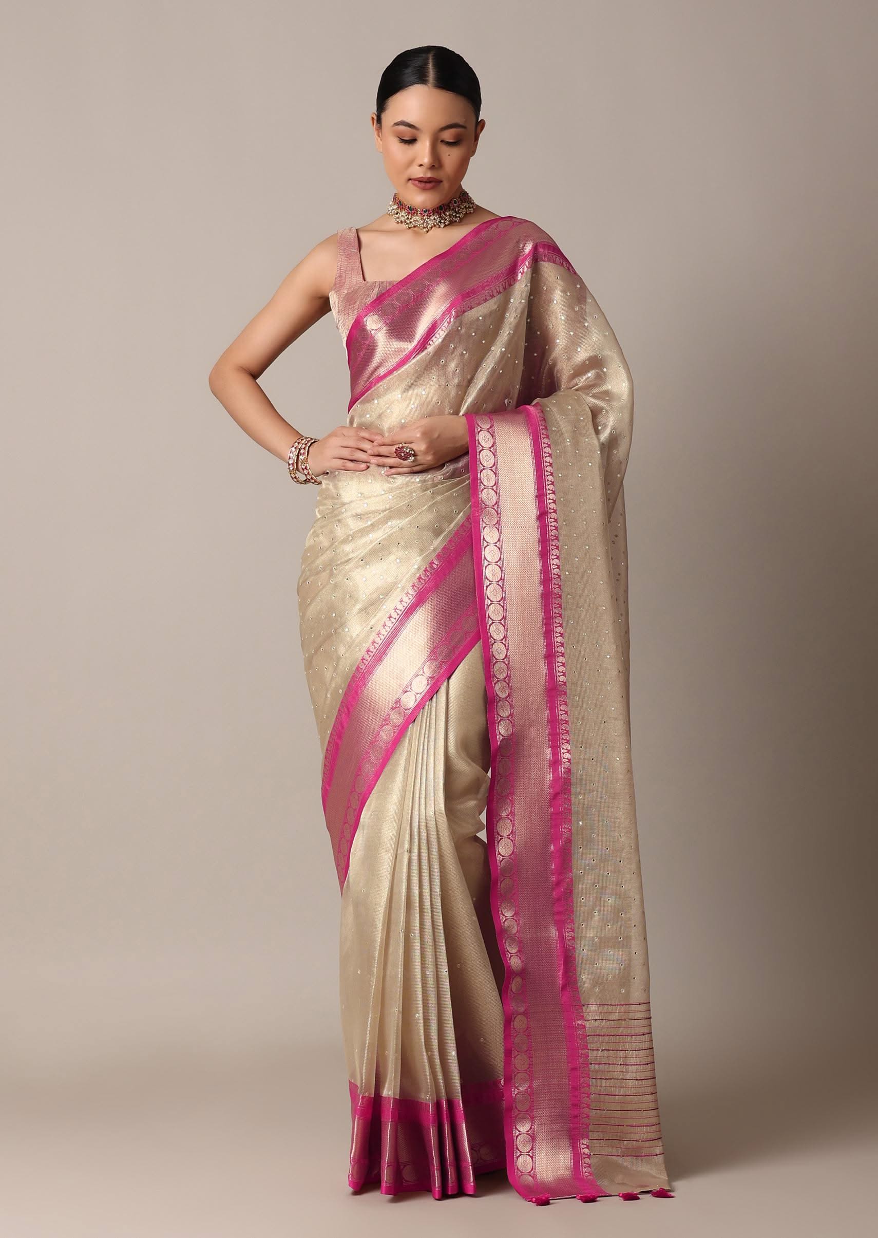 A gorgeous pick for wedding celebrations and reception events is this luxurious twotone saree. Crafted from rich kota silk chanderi fabric it is enhanced with all over woven motifs and mirror work. Elevated with a tassel pallu and meticulous detailing this drape is paired with an unstitched blouse piece. Awarded as the Most Trusted Brand, we're delivering styles you love, just as promised.