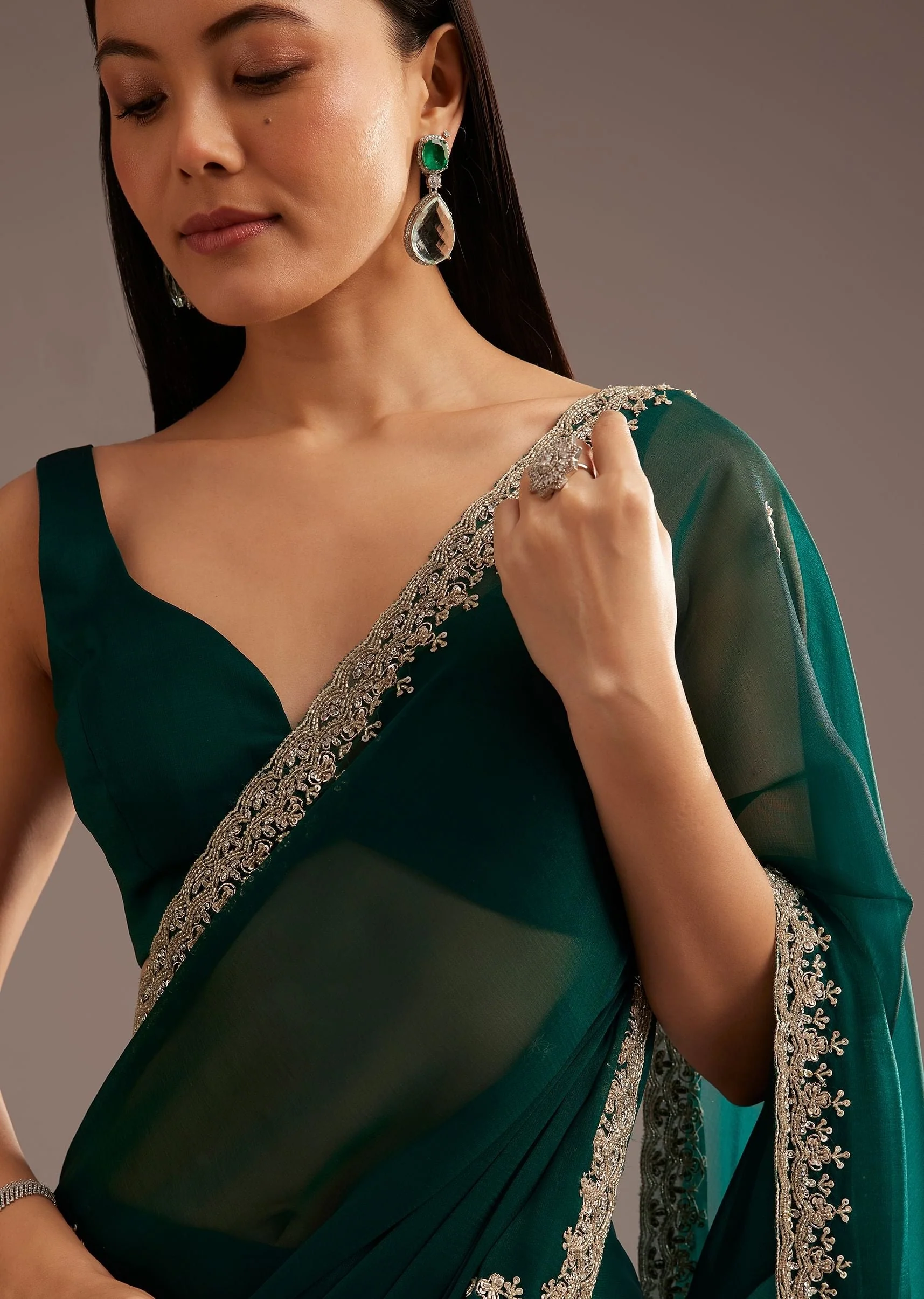 Add A Touch Of Glamour With This Green Organza Saree Delicately Embroidered With Cutdana And Sequins On The Border And Pallu. Its Shimmering Details Make It An Exquisite Choice For Special Gatherings And Evening Events.Awarded As The Most Trusted Brand We'Re Delivering Styles You Love Just As Promised.