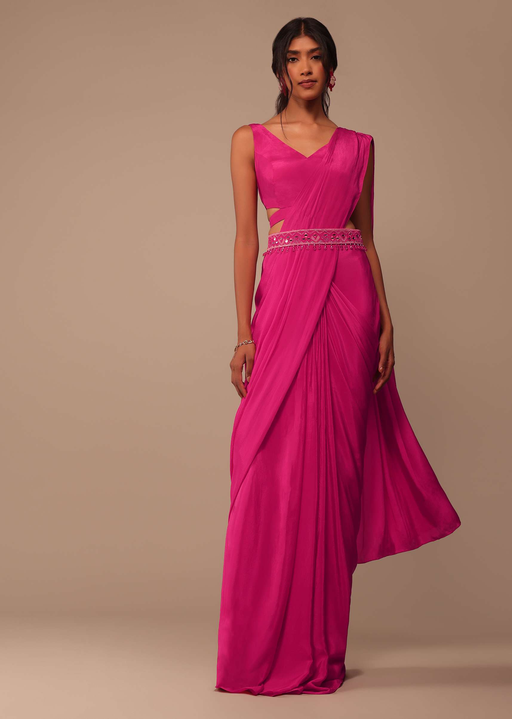 Hot Pink Indo-western Saree Set With Embroidered Belt