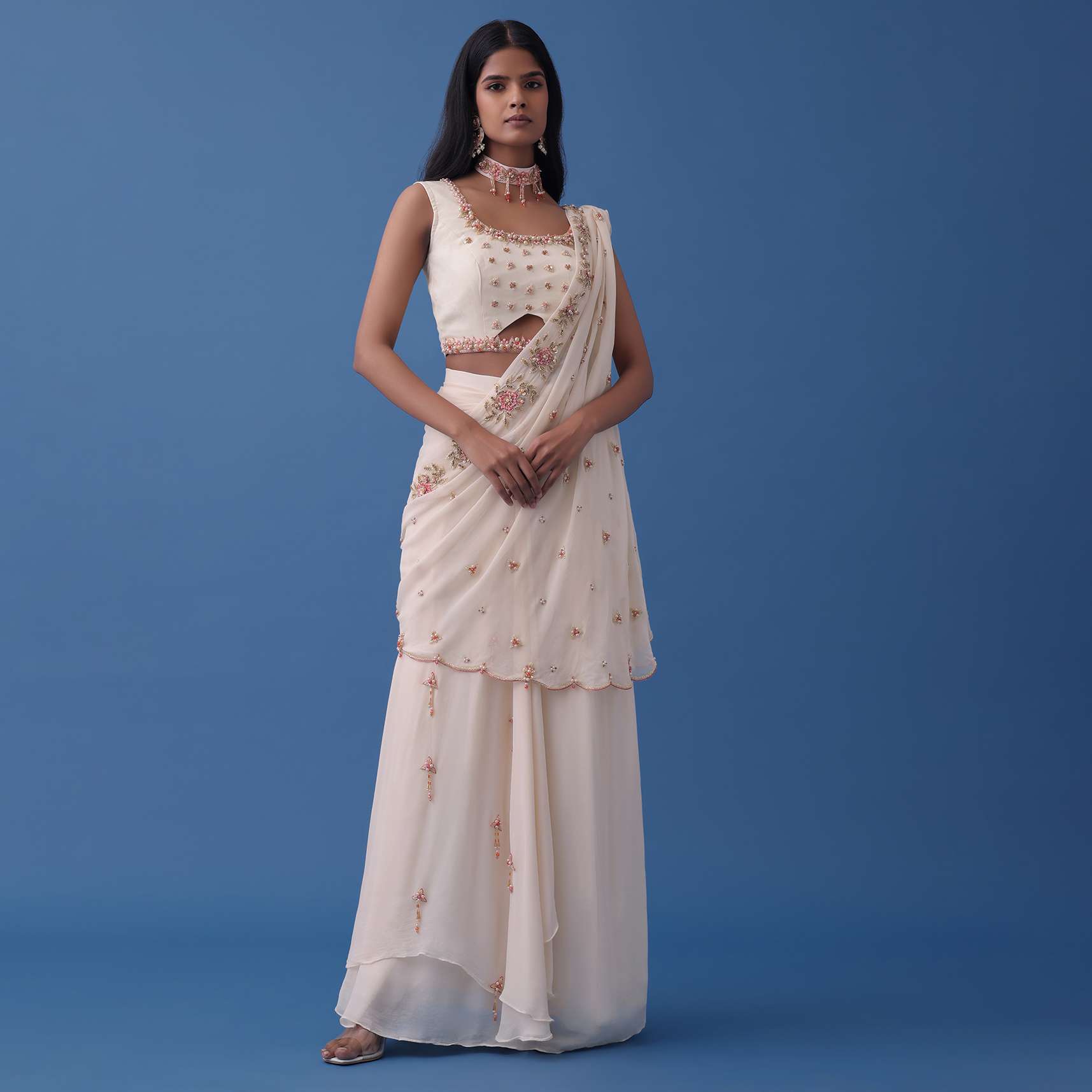 Ivory White Embroidered Indowestern Set With Pre-Draped Dupatta In Georgette