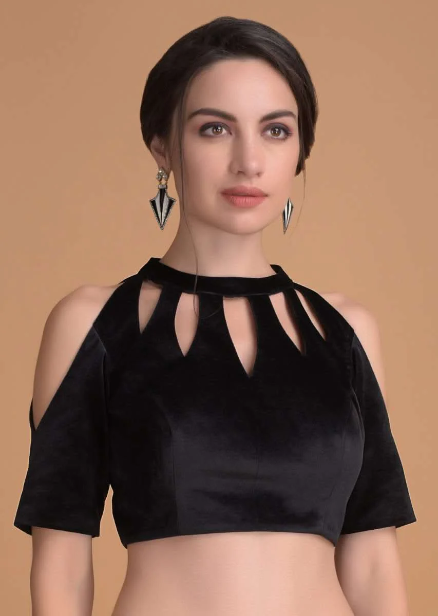 Jet black blouse in velvet with cut out on the neckline.Designed with cold shoulders, half sleeves and high neckline.It comes with back hooks with keyhole pattern.The length of the blouse is 14.5 inches. Awarded as the Most Trusted Brand, we're delivering styles you love, just as promised.