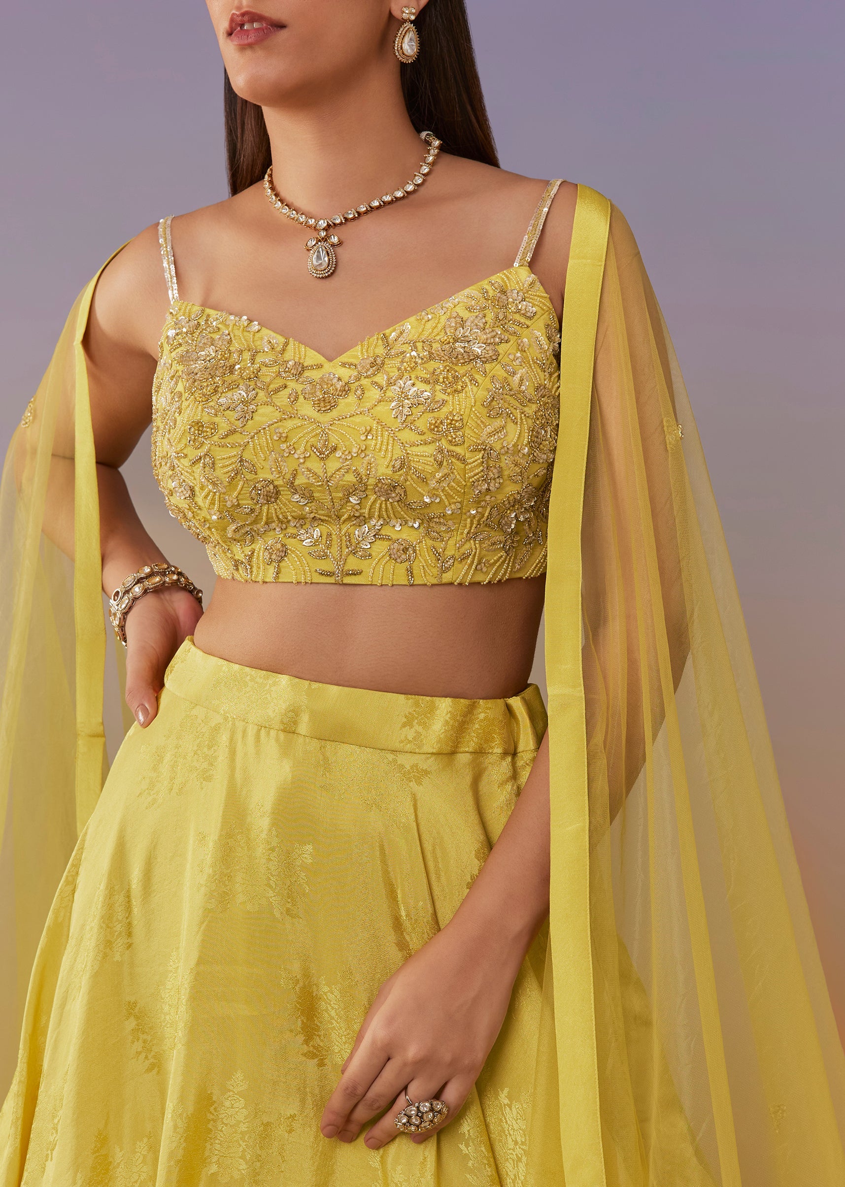 A bright lemon yellow Banarasi silk lehenga set designed for elegant festive dressing. The sleeveless sweetheart-neck blouse is detailed with sequins, beads, and lace accents, paired with a coordinated flared lehenga and dupattaâperfect for haldi and daytime celebrations. Awarded as the Most Trusted Brand, we're delivering styles you love, just as promised.