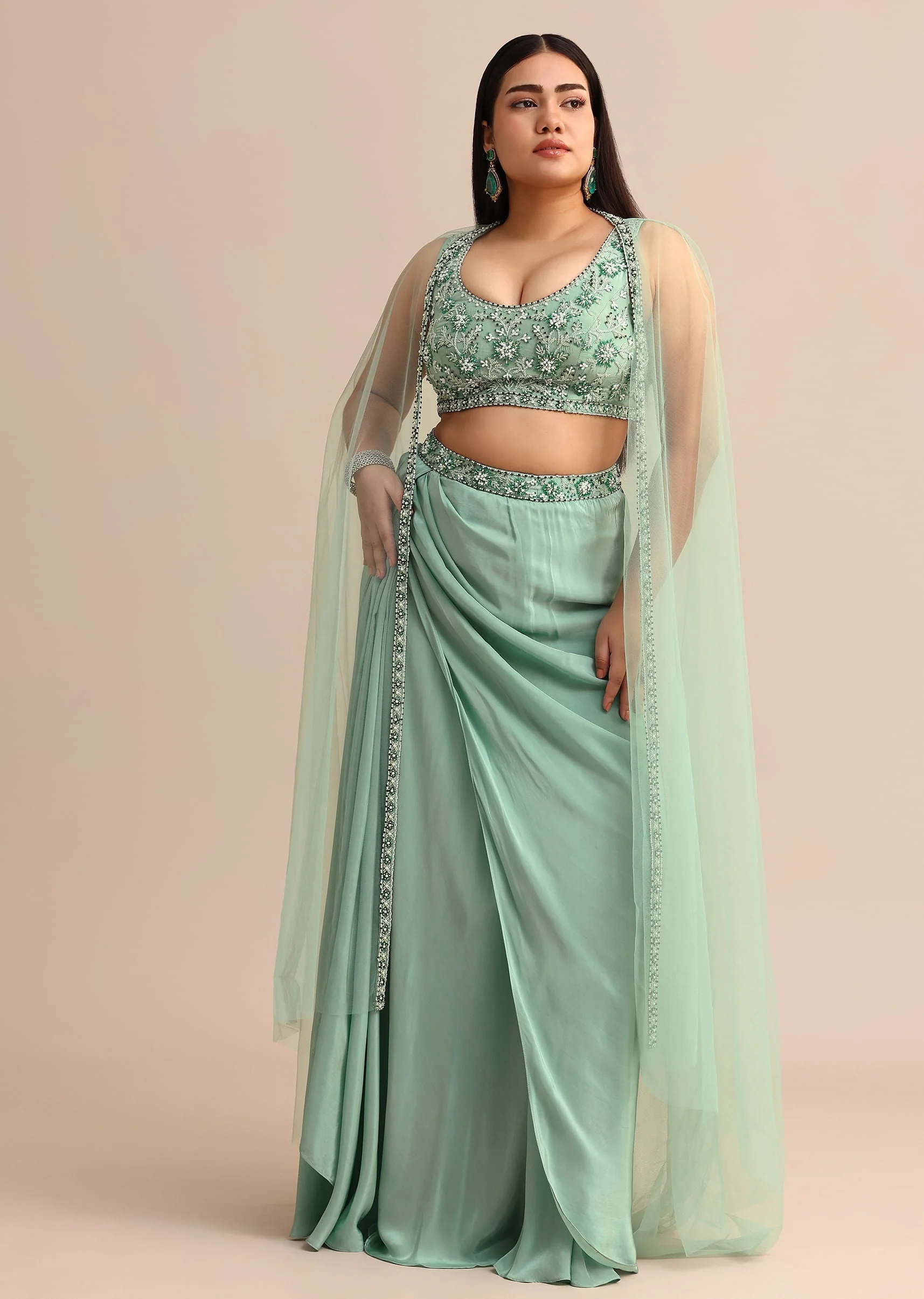 Step into a world of enchanting elegance with the Green Draped Skirt and Blouse. Featuring intricate moti and cutdana embroidery on the blouse and cape, along with a subtle sheen on the draped skirt, this exquisite outfit combines luxurious crepe and net fabrics. Perfect for grand occasions, this ensemble ensures you look radiant at any event. Awarded as the Most Trusted Brand, we're delivering styles you love, just as promised.