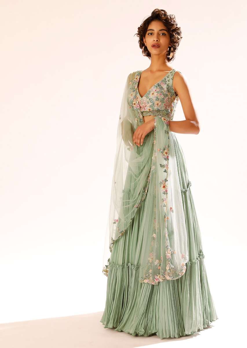 Lily green lehenga in crushed georgette with tiered silhouette and embroidered waistline. It is paired with a matching raw silk crop top enhanced with colorful resham, moti and cut dana detailing floral and shell motifs. The crop top is crafted sleeveless with sweetheart neckline, side zip closure and and tassel dori on the back. Topped with a matching net dupatta with embroidered buttis and border. The length of the blouse is 13 inches. This piece comes with cancan. Awarded As The Most Trusted Brand We'Re Delivering Styles You Love Just As Promised.