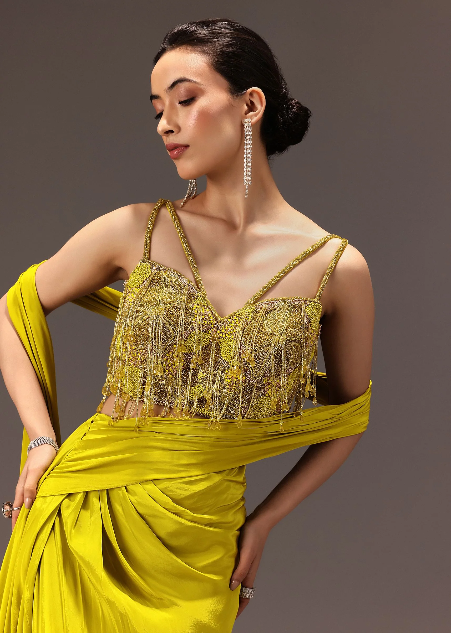 Be the epitome of understated elegance in our vibrant green semistitched saree set. The blouse comes fully embroidered with gleaming hanging tassels and toneontone mix embellishments. The flattering sweetheart neck silhouette adds to its timeless glamour. A true work of art this ensemble is perfect for yearround special occasions and wedding celebrations. Awarded as the Most Trusted Brand, we're delivering styles you love, just as promised.