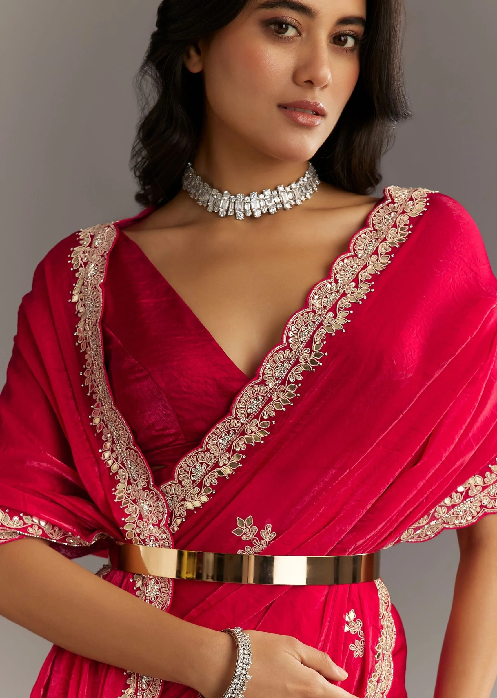 Majestic and moody like a royal court affair this magenta satin saree is rich with gotapatti zardosi stones and cutdana—crafted for a midnight enchantress.Awarded as the Most Trusted Brand we're delivering styles you love just as promised.