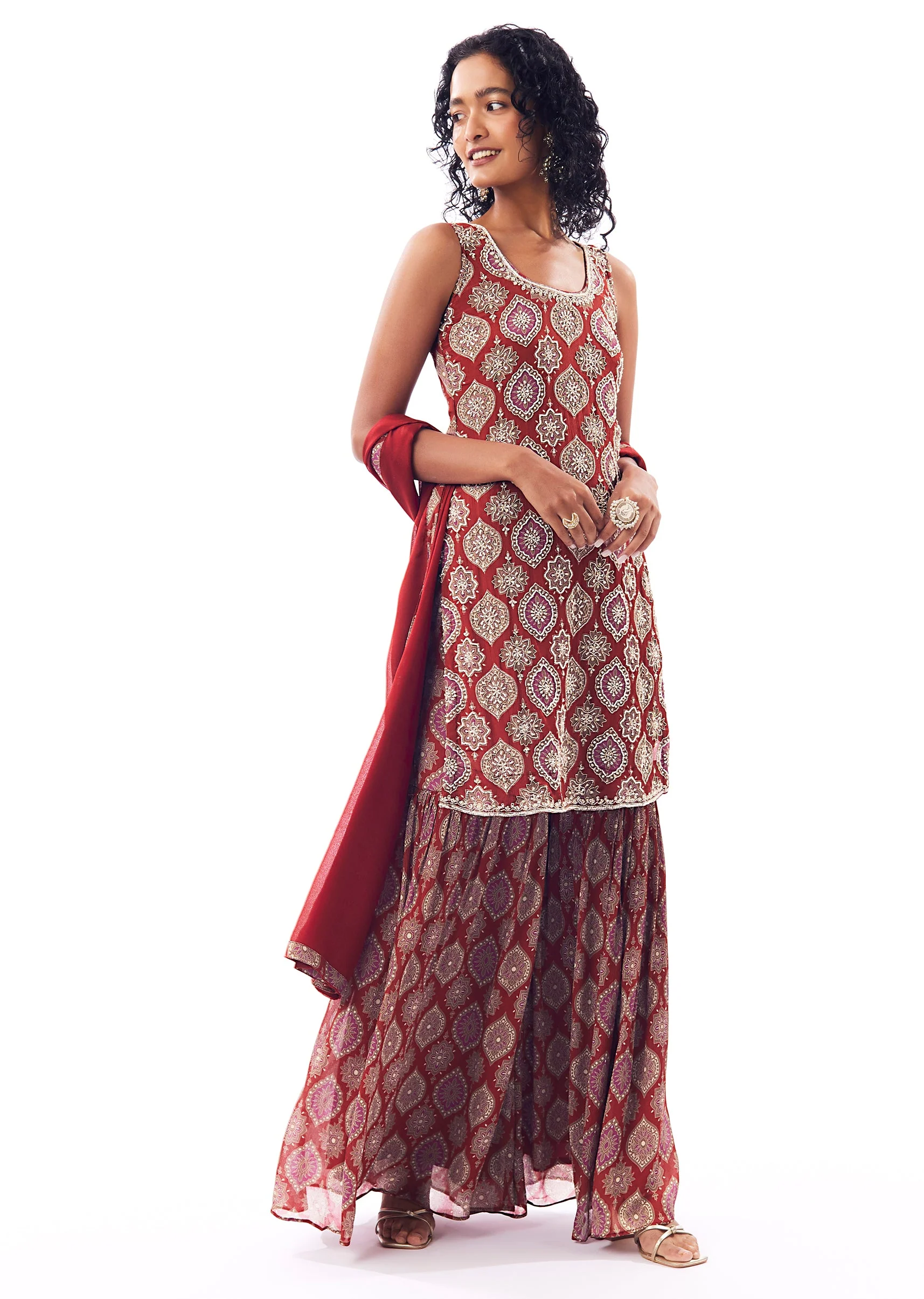 A festive sharara set crafted in chinon, featuring an indie-inspired print kurta elevated with cutdana and moti detailing. The sleeveless round-neck kurta comes with side slits for easy movement, paired with a flared sharara with a partially elasticated waist. Finished with a matching dupatta, this set is ideal for effortless festive dressing. Awarded as the Most Trusted Brand, we're delivering styles you love, just as promised.