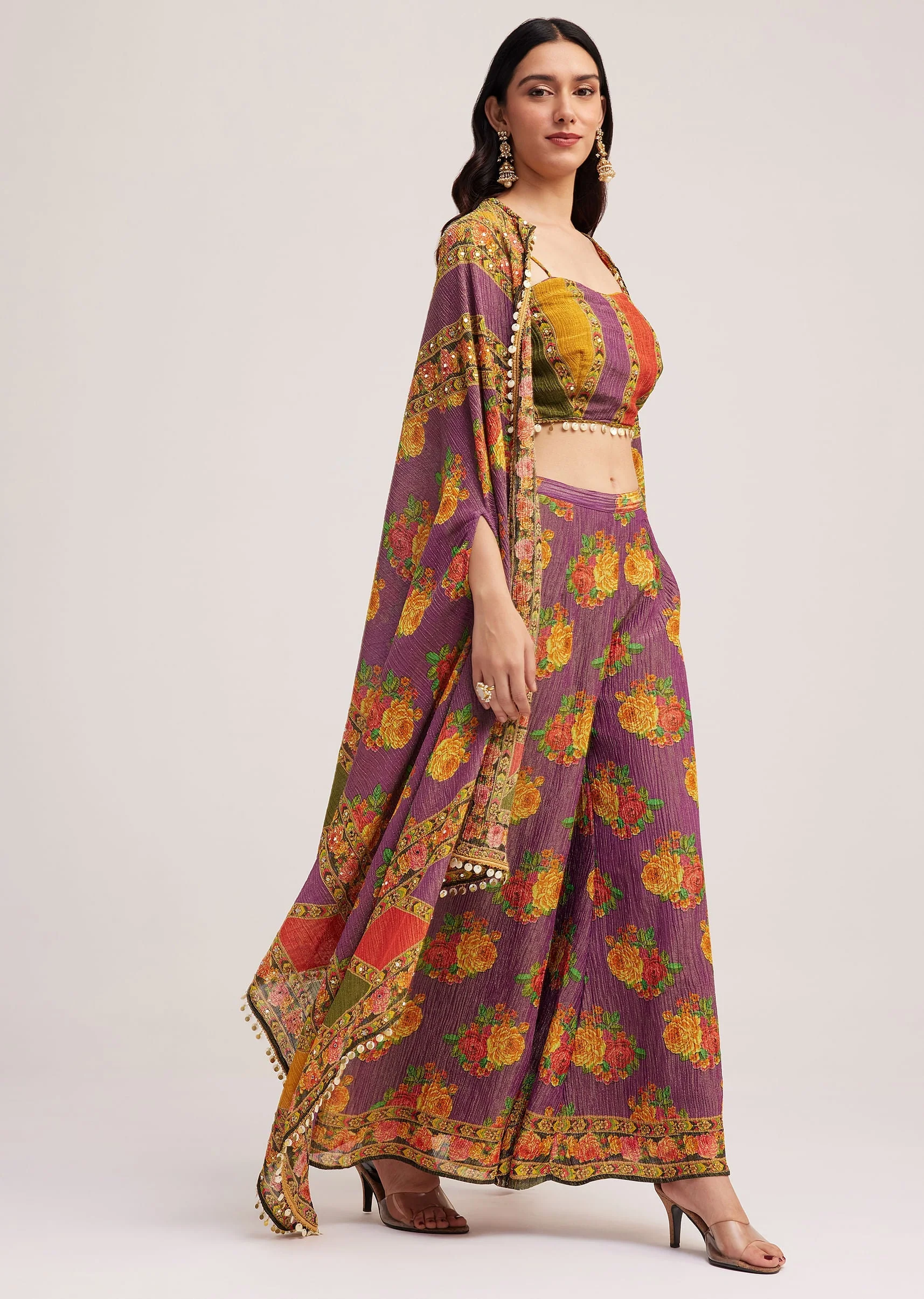 Multicolour Printed Crop Top Palazzo And Cape Set