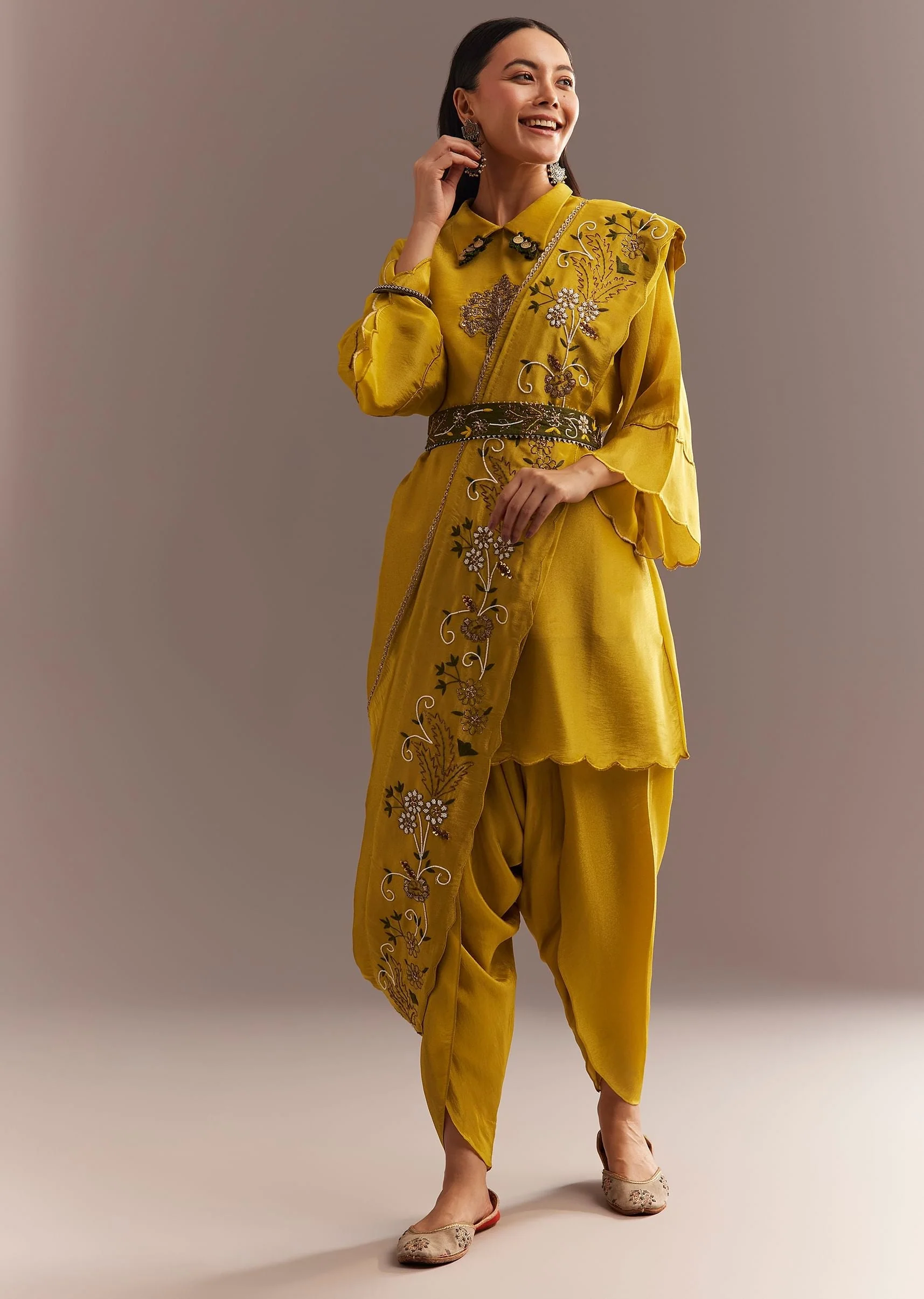 Mustard Tissue Embroidered Kurta Dhoti With Pre Draped Dupatta And Belt