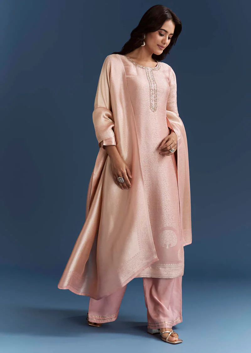This peach kurta set showcases fine banarasi tissue fabric accentuated with intricate zardosi work on the neckline and a coordinated dupatta. A sophisticated choice for festive events with a soft pastel palette. Awarded as the Most Trusted Brand, we're delivering styles you love, just as promised.