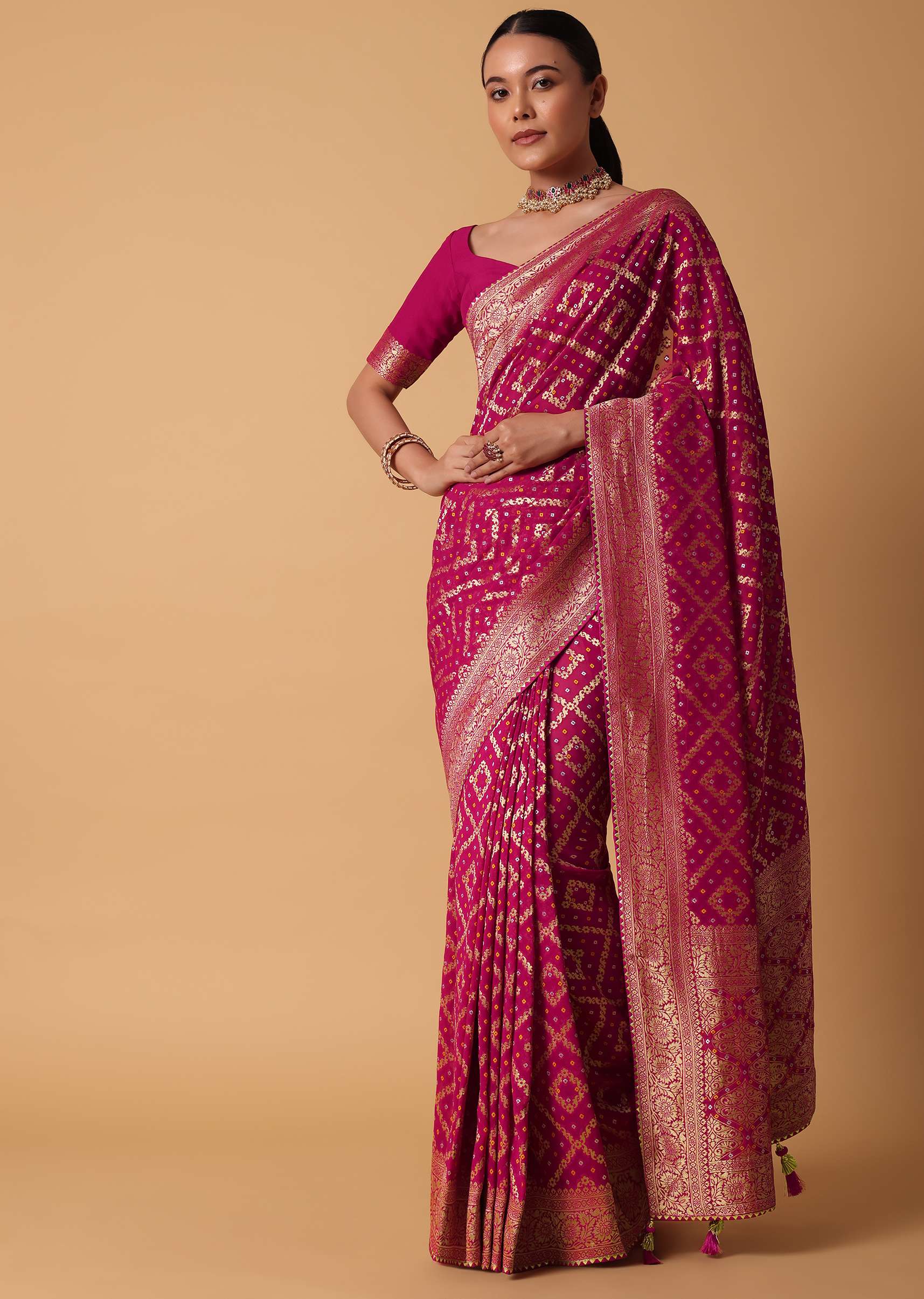 Add a touch of elegance to your wedding wardrobe with this traditional and classic pink saree. Fabricated from rich banarasi georgette it boasts of timeless zari and bandhani woven motifs all over. Elevated with a tassel detail pallu this drape comes with an unstitched blouse piece. Awarded as the Most Trusted Brand, we're delivering styles you love, just as promised.