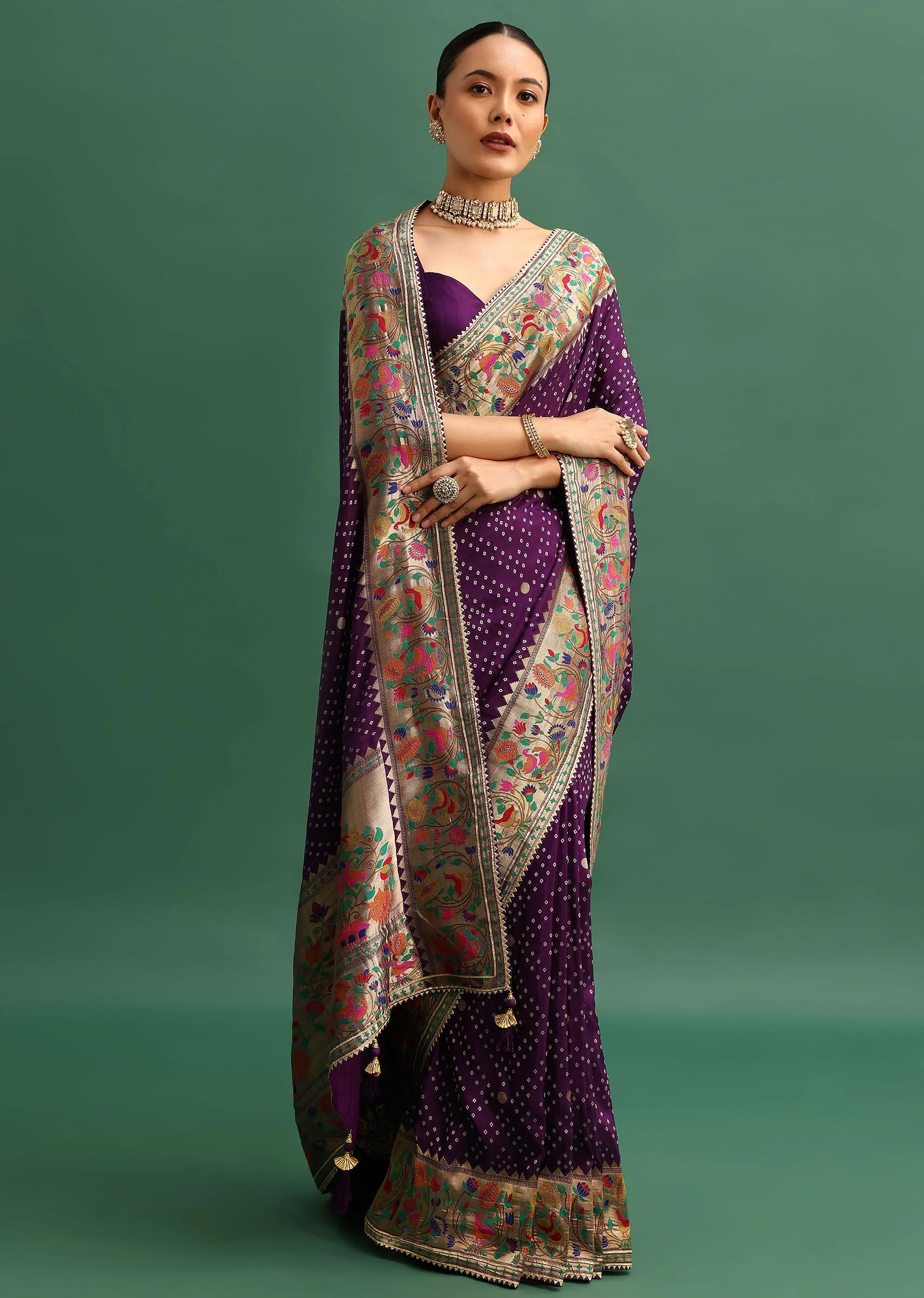 Purple Silk Woven Bandhani Saree With Paithani Border Pallu And Unstitched Blouse