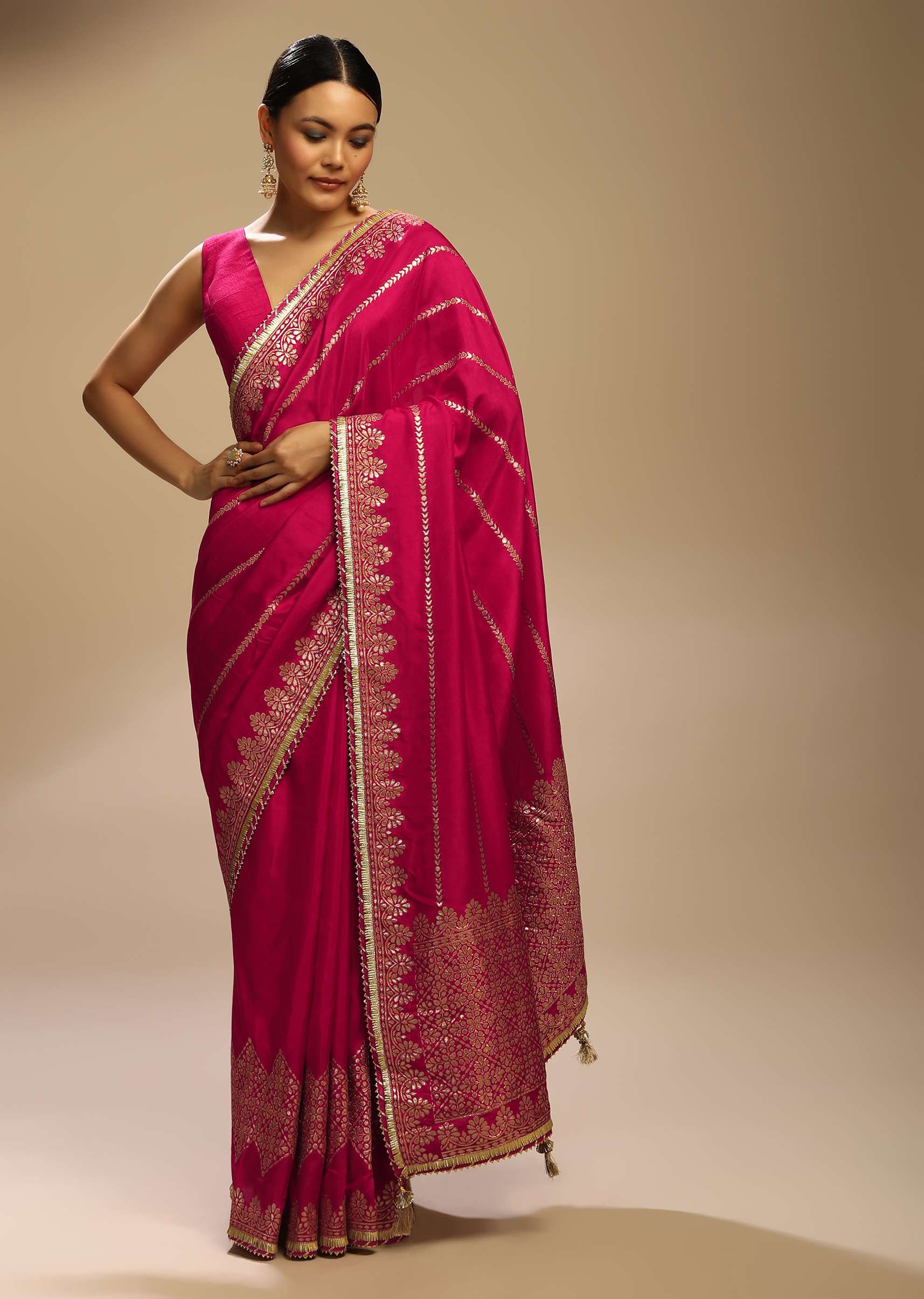 Rani pink saree in silk with ethnic motifs woven in striped design. The border and pallu are adorned with woven geometric and floral motifs along with gotta lace trims. Edged with tassels on the pallu. The saree comes with a matching unstitched blouse. Awarded As The Most Trusted Brand We'Re Delivering Styles You Love Just As Promised.
