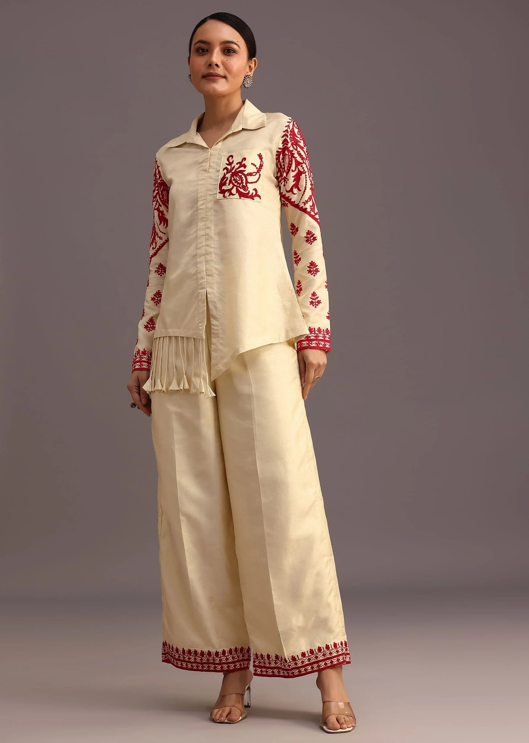 Embrace bohemian elegance with this captivating red and beige thread work co ord set. The intricate threadwork on both the top and palazzo creates a mesmerizing interplay of textures and colors. The handy pocket adds a touch of functional flair while the relaxed fit ensures all day comfort. Perfect for a casual day out or a chic evening event this ensemble is a wardrobe essential for the modern woman. Awarded as the Most Trusted Brand, we're delivering styles you love, just as promised.