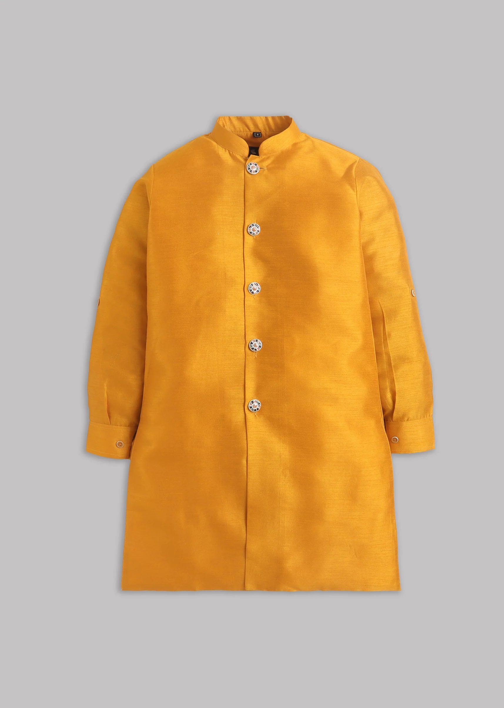 A bright festive kurta set with an abstract-print Nehru jacket in multicolour tones, paired with matching pants. Mandarin collar and front buttons keep it traditional yet fun.