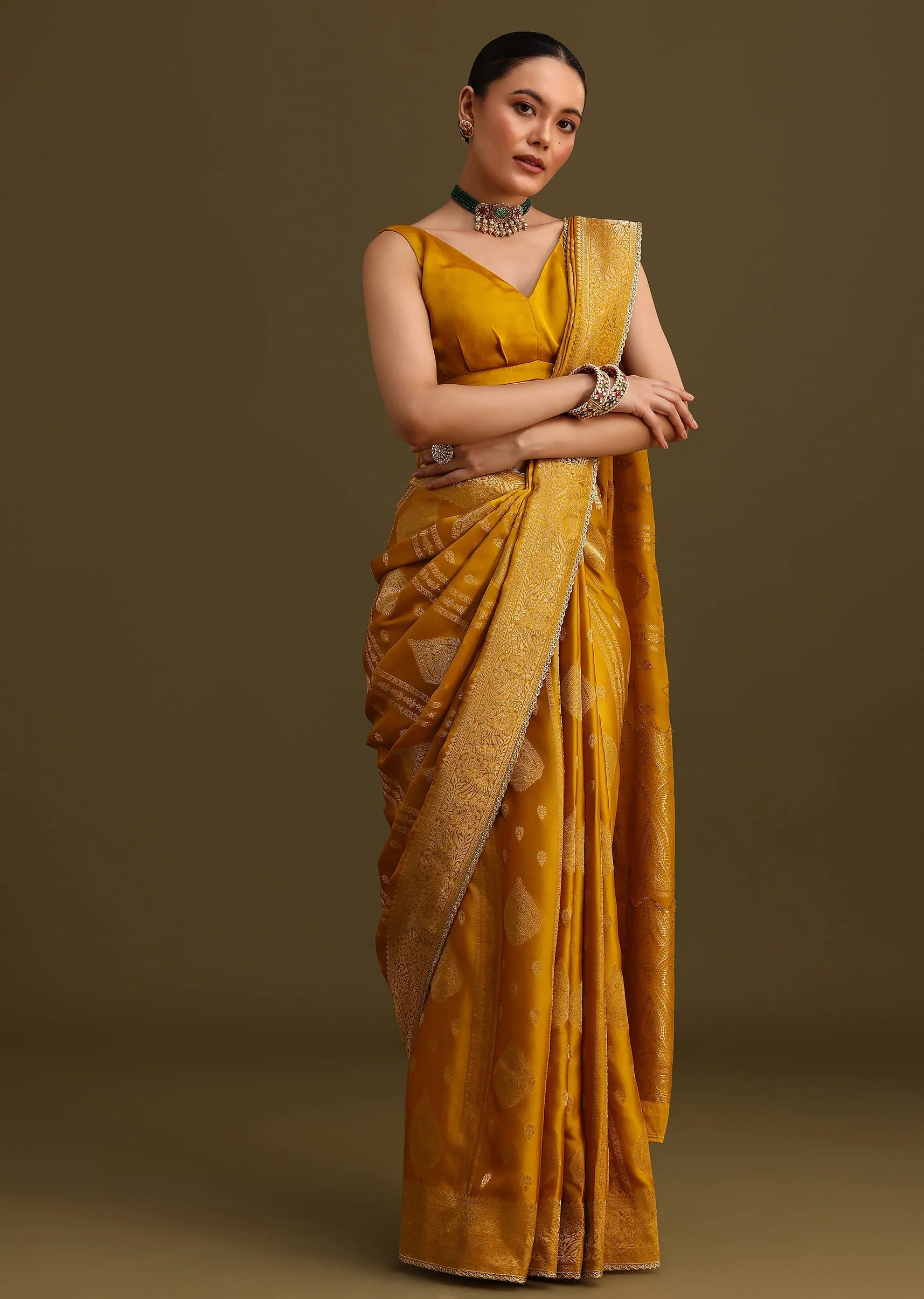 Treat yourself to the luxury of this yellow brocade zari weave saree. The soft satin fabric and intricate embroidery will make you feel like royalty. Let this saree be the centerpiece of your festive wardrobe and turn heads wherever you go. Blouse design may vary. Awarded as the Most Trusted Brand, we're delivering styles you love, just as promised.